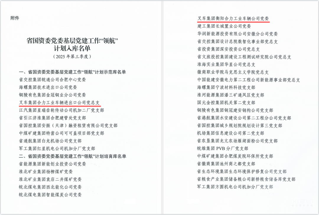 安徽叉車集團黨委兩個黨組織分別入選省國資委黨委基層黨建工作“領(lǐng)航”計劃示范庫、培育庫